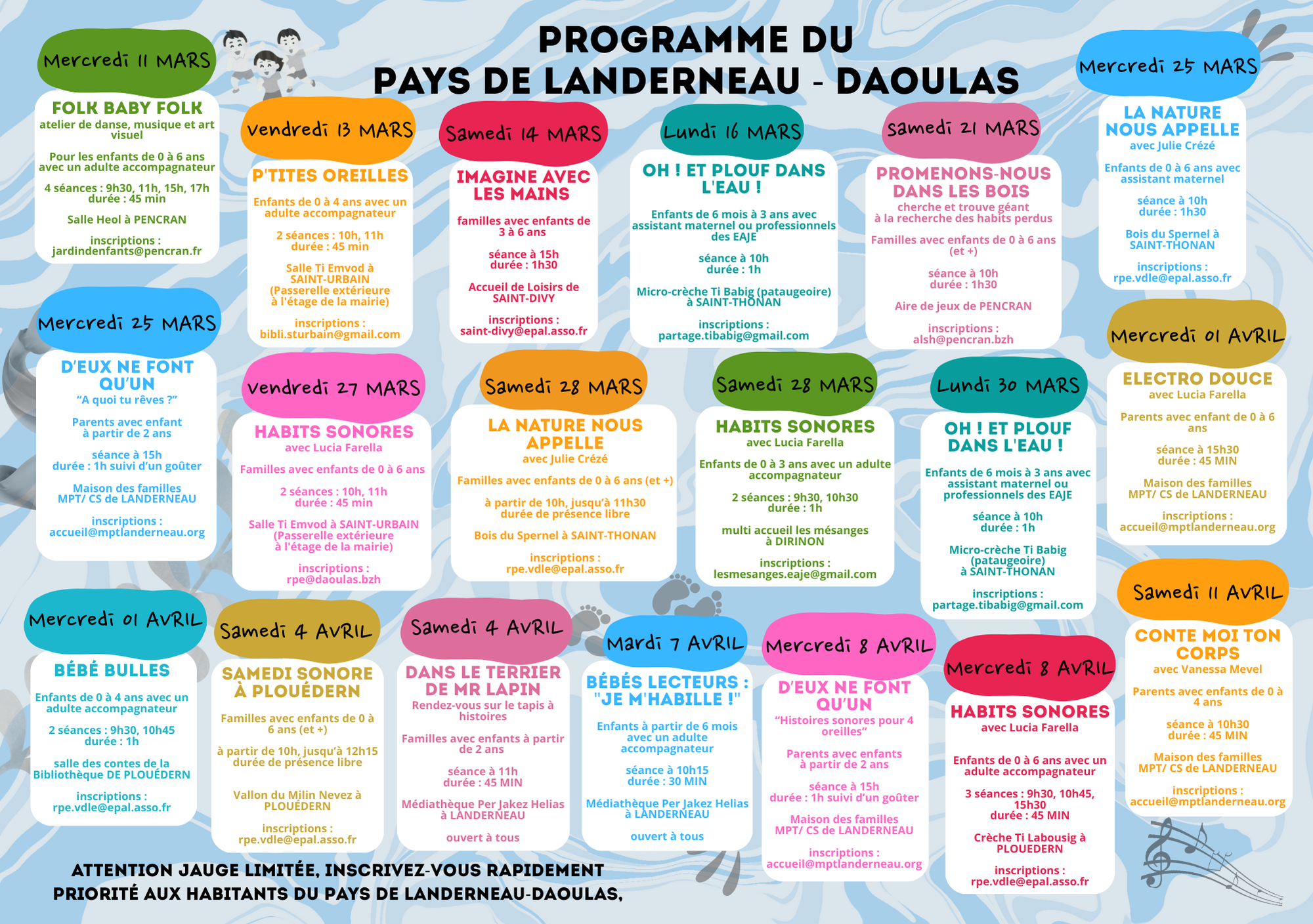 Les acteurs Petite Enfance du Pays de Landerneau-Daoulas se mobilisent encore cette année pour vous proposer des temps privilégiés avec les enfants de 0 à 6 ans.